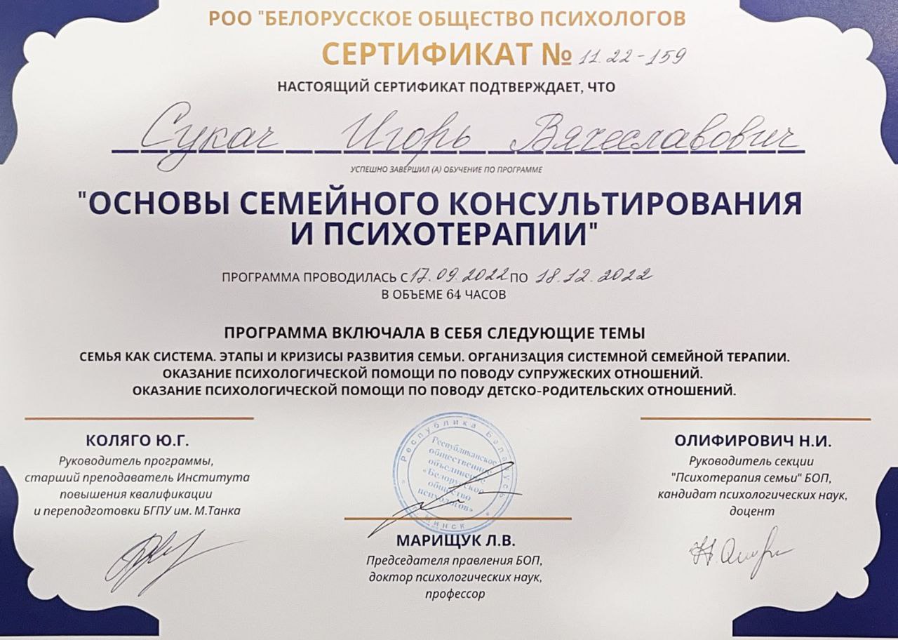С этой целью я освоил второе академическое образование и курсы повышения квалификации. Сейчас стремление к профессиональному росту привело меня к обучению в международной школе консультирования и психотерапии института «Гармония» в Санкт-Петербурге, где я имею возможность учиться у признанных специалистов в этой области. В работе придерживаюсь интеграционного, системного подхода с экзистенциальным уклоном.